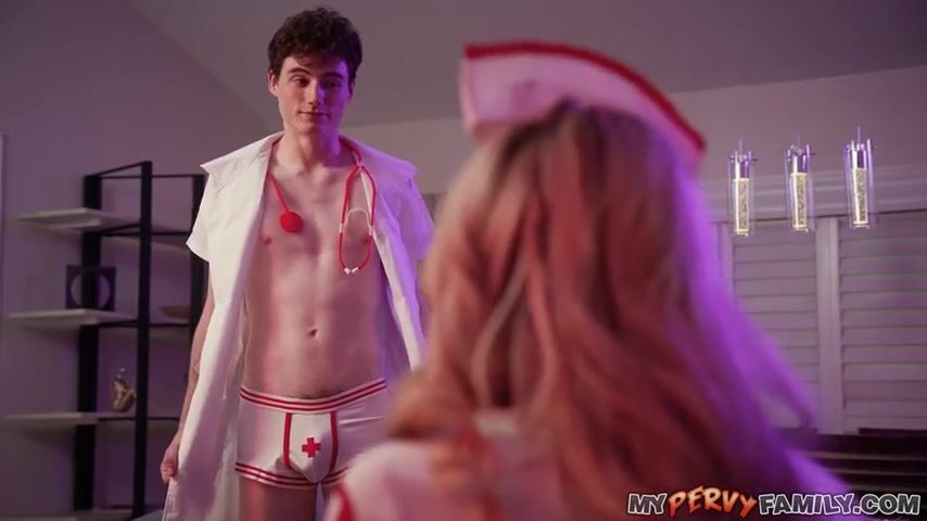 Couples' costumes are just weird. It's always the woman who pushes for them too, right? When Ellie Tay's husband has a last minute business trip during Halloween, she is stuck with one half of a couples' costume. She wants to be a sexy nurse, but is missing her handsome doctor. What if... what if her stepson Jodie Johnson is down though?? Kind of inappropriate, but Ellie can't help herself. She has been watching her stepson and she wants a piece. Jodie's costume is a bit limp-wristed, it even includes tighty whities! But he doesn't care, his stepmom is gorgeous! She pulls his cock out of his underwear and begins to suck & stroke her stepson while she rubs her clit. Jodie takes his stepmother from behind, banging her out while her tis clap together. Ellie cums on her stepson's hard cock, her fantasy finally fulfilled. Jodie unloads all over his stepmom's face and in her mouth. Now that's a happy Halloween folks!